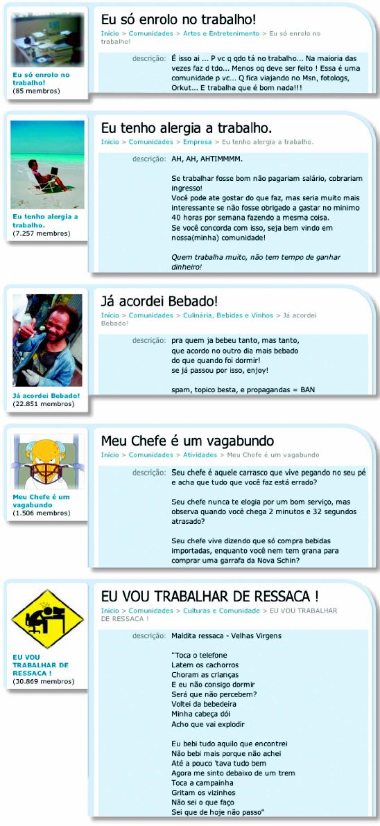 Um caso clássico são as comunidades do Orkut. Aderir a elas pode até ser divertido, mas talvez seu futuro chefe não queira vê-lo na "Trabalho de ressaca" ou "Meu chefe é um saco". Da mesma forma, é preciso pensar duas vezes antes de espalhar pelo serviço de microblog Twitter o quão preguiçoso, enrolado, bêbado ou mal humorado você costuma ser no escritório. "Isso tudo pode virar contra você. O profissional tem que verificar essas coisas na internet para não deixar vestígios que denigram a sua imagem", recomenda a consultora e sócia da Chess Human Resources, Michele Carvalho Gelinski.
