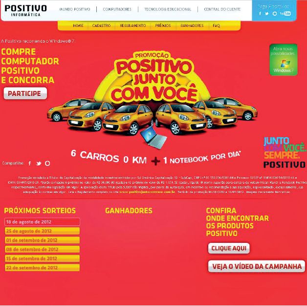 A Positivo Informática vai sortear seis carros e 42 notebooks entre os consumidores que comparem um computador da empresa equipado com o sistema operacional Windows. A promoção "Positivo Junto com Você" começou na semana passada e vai até 16 de setembro. Todos os dias um notebook Positivo Premium com Positivo 3D será sorteado e, a cada semana, um Nissan March. Mais informações sobre a promoção estão disponíveis no endereço www.positivojuntocomvoce.com.br.