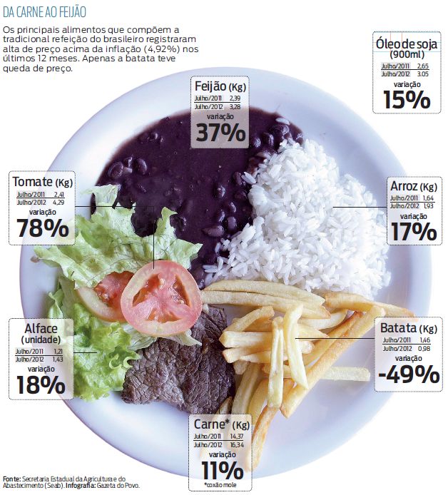 O tradicional prato feito (PF) está 18% mais caro em relação a julho do ano passado. Nos últimos 12 meses, cinco dos seis alimentos que não podem faltar na mesa do brasileiro arroz, feijão, carne, alface e tomate registraram alta de preço. Só a batata, também tradicional, teve baixa. A conclusão é que o custo do PF aumentou 3,7 vezes mais que o Índice Nacional de Preços ao Consumidor Amplo (IPCA) no mesmo período (4,9%). E como esses itens seguem tendência de alta, deverão fortalecer a inflação neste semestre, dizem os especialistas.