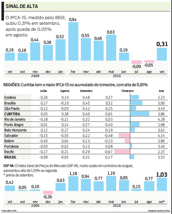 O IPCA-15, prévia da inflação oficial, registrou alta de 0,31% em setembro, acelerando frente à deflação de 0,05% verificada em agosto, de acordo com os dados do Instituto Brasileiro de Geografia e Estatística (IBGE) divulgados ontem.