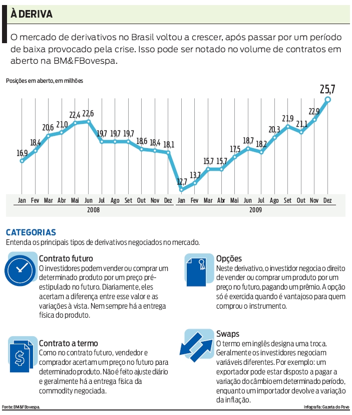 Na semana passada, o Conselho Monetário Nacional (CMN) aprovou uma nova medida para aumentar o controle sobre derivativos agora, negociações feitas no exterior precisam ser registradas no país. A decisão tenta aumentar a transparência em um mercado que voltou a crescer com todo o vapor nos últimos meses. Na BM&FBovespa, o volume de negócios com esse instrumento alcançou em dezembro o maior valor da história, com mais de 25 milhões de contratos abertos. O recorde marca uma reação desse tipo de transação financeira, que ficou com a imagem arranhada durante a crise econômica e atingiu o fundo do poço em janeiro do ano passado, quando foram abertos 12,7 milhões de contratos. Além dos contratos na Bovespa, há quase R$ 350 bilhões em derivativos registrados na Cetip, entidade que organiza o mercado de balcão.