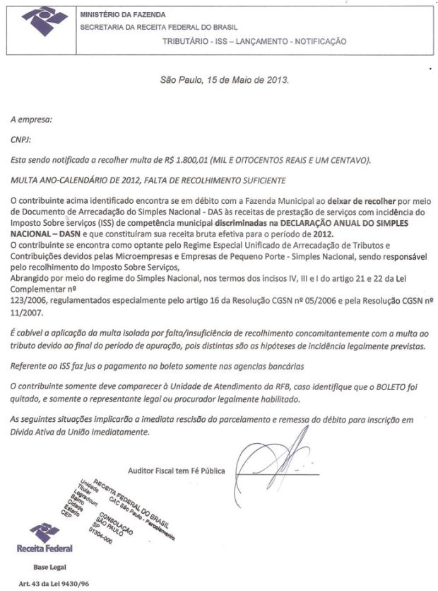 Segundo a Receita, a falsa notificação vem acompanhada de um título bancário com o valor da suposta multa a ser paga em qualquer agência bancária. Além do texto confuso, há vários aspectos que demonstram a falsidade do documento. O ISS, por exemplo, é um tributo de competência municipal, e não federal. Outro problema na correspondência é que a Receita não emite títulos bancários e sim, o Documento de Arrecadação de Receitas Federais (DARF).