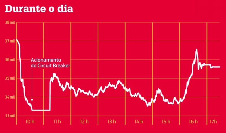 No pregão de ontem, após a melhora sentida na última hora de operações, a Bovespa conseguiu encerrar com queda de 3,97%, bem menos intensa que a verificada no começo do dia. Em seu momento mais crítico, a bolsa paulista recuou 10,36%. Às 10h35, com as perdas rompendo o limite de baixa de 10%, foi acionado o "circuit breaker", sistema que interrompe o pregão e as negociações foram suspensas por 30 minutos.