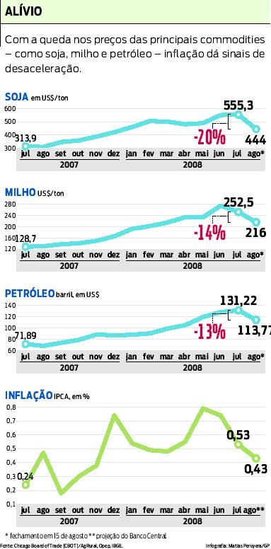 A queda nos preços internacionais de commodities como soja, milho, trigo e petróleo promete dar uma trégua na inflação, pelo menos até o fim do ano. O consumidor deve sentir no bolso um ritmo menos intenso de reajustes. A redução da demanda nos Estados Unidos, na Europa e no Japão e a saída de alguns fundos de investimento desses mercados fizeram despencar os preços de produtos que vinham incendiando a inflação nos últimos meses.