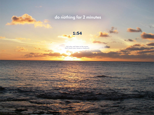 Um site propõe um desafio ao internauta: ficar dois minutos sem fazer nada online, apenar olhando uma paisagem de mar e ouvindo o barulho de ondas. É o www.donothingfor2minutes.com.