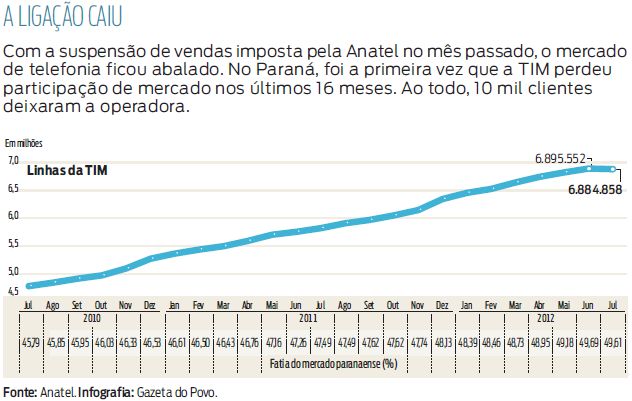 No Paraná, o setor encolheu. Ao todo, foram 856 linhas a menos em relação a junho. A TIM, operadora afetada com a suspensão no estado, teve um déficit de 10 mil clientes. Foi a primeira vez, em 16 meses, que a empresa perdeu participação de mercado no estado, caindo de 49,69% em junho para 49,61% em julho. A última vez que isto aconteceu foi em março de 2011.