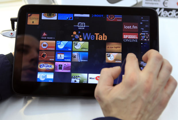 Consumidores testam o novo tablet WeTab que chegou às lojas da Europa nesta sexta-feira (1º). O aparelho que concorre com o iPad, da Apple, roda um sistema operacional MeeGo, baseado em Linux. Seu preço inicial é de 570 euros.