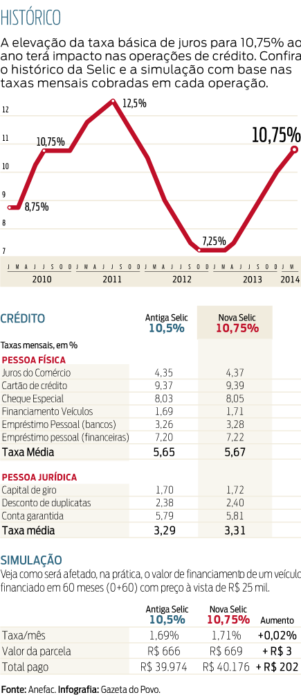 Com o aumento para 10,75% ao ano, a taxa média de juros para pessoas físicas ficará em 93,83% ao ano (ou 5,67% ao mês), segundo cálculos da Associação Nacional dos Executivos de Finanças, Administração e Contabilidade (Anefac). Em janeiro, o juro médio ao consumidor ficou em 93,39% ao ano (ou 5,65% ao mês o maior nível desde setembro de 2012), ainda de acordo com a associação.