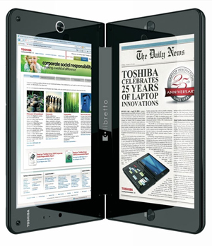 A Toshiba lançou nesta segunda-feira (21) um computador portátil de pequeno porte equipado com duas telas que pode ser usado como leitor eletrônico. O aparelho, chamado Libretto, coloca a empresa em competição com o iPad, da Apple, e o Kindle, da Amazon.