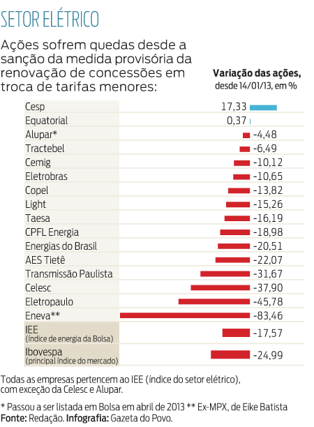 As empresas que renovaram as concessões, como Eletropaulo (distribuidora de energia), tiveram queda mais acentuada. Já as que não renovaram, casos da Copel e da Cesp, a companhia de energia de São Paulo (ambas de geração e transmissão), caíram menos ou até subiram. A Copel, por exemplo, desvalorizou 13,82%. Já a Cesp, com valorização de 17,3% das ações no período até hoje, foi a única a não renovar a concessão em nenhum dos dois segmentos em que atua.
