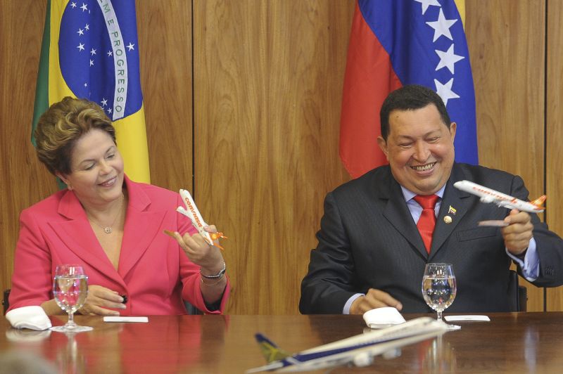 Os presidentes Hugo Chávez e Dilma Rousseff assistiram à assinatura do acordo, que prevê a entrega, até o final do ano, das primeiras seis aeronaves do tipo E-190 por 270 milhões de dólares.
