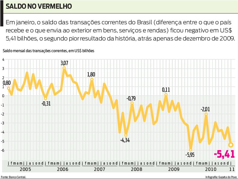 Maciel também previu que o déficit em conta corrente no mês de fevereiro deve ficar em US$ 3 bilhões. Ele aponta o número menor de dias úteis do mês e também a sazonalidade da balança comercial para justificar a melhora.