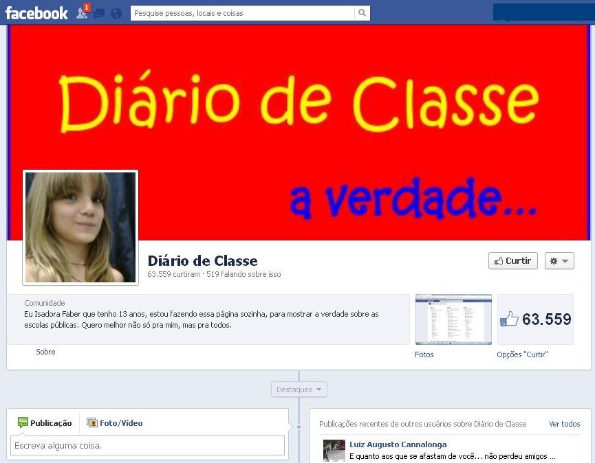 Em pouco mais de um mês, a página Diário de Classe, que Isadora criou no Facebook, recebeu até esta terça-feira (28) quase 63 mil "curtir" e cada uma das publicações tem dezenas de comentários elogiosos à guria que não teve medo de mostrar a situação da Escola Básica Municipal Maria Tomázia Coelho, em Florianópolis.
