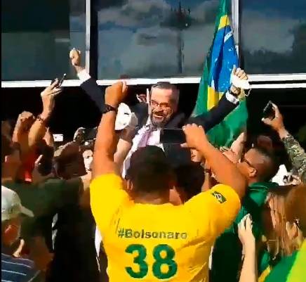 Após prestar depoimento à Polícia Federal na tarde desta quinta-feira (4), o ministro da Educação, Abraham Weintraub, foi ovacionado e carregado por simpatizantes enquanto saía do edifício sede da Polícia Federal, em Brasília.