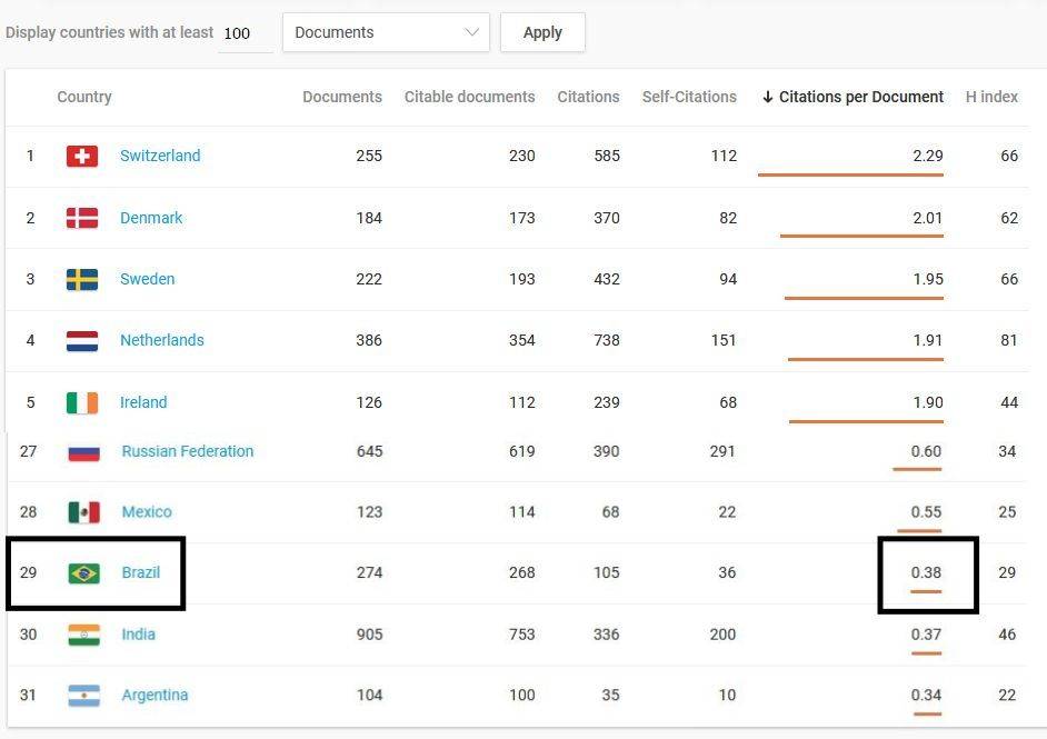 O cálculo é do professor da Universidade de Brasília Marcelo Hermes, que há meses vem produzindo uma sequência de estudos a respeito da relevância internacional da produção acadêmica brasileira. O professor baseia sua análise nas listas comparativas produzidas pela Scimago Institutions Rankings, que indexa dados do Scopus, a maior plataforma que reúne dados científicos de todo o mundo.