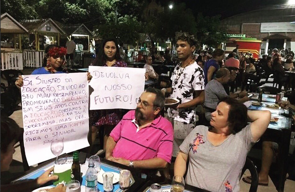 Na mesa, Weintraub, a esposa e os três filhos foram rodeados de cartazes que traziam "Devolva nosso futuro", "Sr. Sinistro da educação, devido ao seu mau desempenho, promovendo balbúrdia em seus atos contra a educação, cortamos 3 chocolatinhos da sua sobremesa, mas oferecemos uma kafta para o senhor".