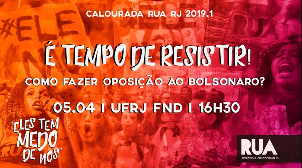 Nesta sexta-feira (5), a Faculdade Nacional de Direito da Universidade Federal do Rio de Janeiro (FND-UFRJ) realizará um evento de nome "É tempo de resistir" para discutir "como fazer oposição ao Bolsonaro". Deputado Federal pelo PSOL-RJ (Partido Socialismo e Liberdade), Marcelo Freixo, que estará presente na "Calourada da Rua RJ 2019.1", disse, no Twitter, que se trata de uma "mesa de conversa para falar sobre os desafios e organização de lutas no governo Bolsonaro". Apenas filiados ao PSOL foram convidados para o "debate", são eles: Mariana Teodozio, estudante de pedagogia da UFRJ e ativista no RUA - Juventude Anticapitalista e Wesley Teixeira, Coordenador do Pré-Vestibular Popular + Nós e estudante de pedagogia da FEBF-UERJ.