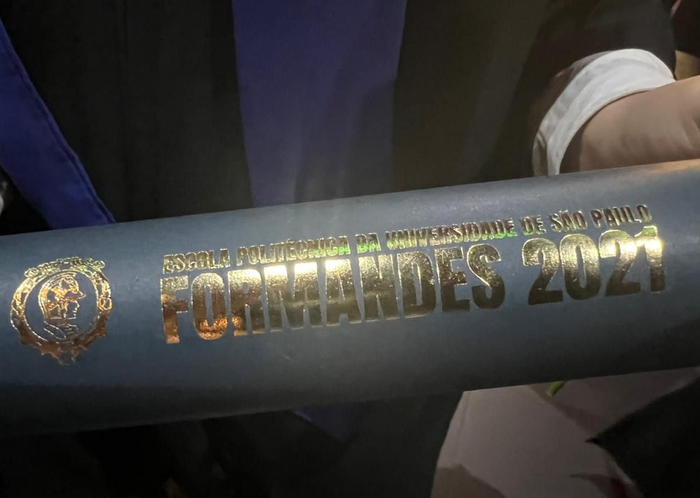 Os alunos da comissão de formatura da Escola Politécnica da Universidade de São Paulo (USP) decidiram utilizar, em sua colação de grau festiva, um canudo com a inscrição "Formandes 2021". O evento, ocorreu nesta quinta-feira (27), no Espaço das Américas, em São Paulo, e contou com a presença do diretor da Poli-USP, Reinaldo Giudici, e professores da graduação.