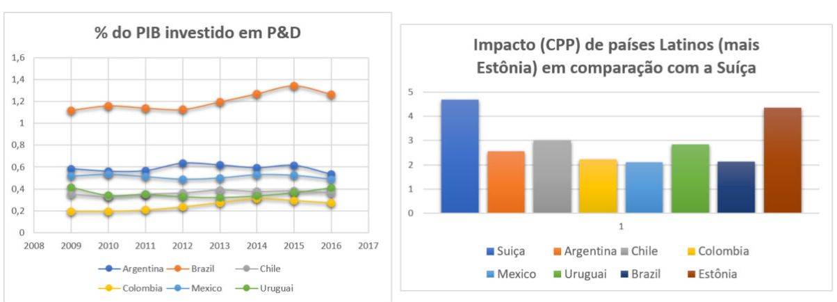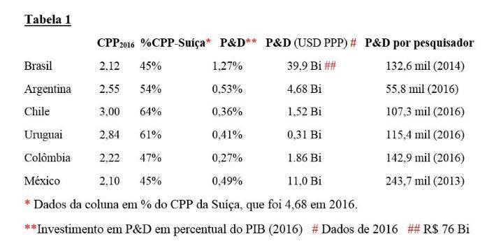 Ao analisar países ao nosso redor, verificamos que o Brasil está atrás da Colômbia, Argentina, Uruguai, e Chile com relação ao impacto científico. Esses países apresentam 47%, 54%, 61%, e 64%, respectivamente, do CPP da Suíça. O Chile, por exemplo, ficou em 28º lugar no ranking CPP-2016 entre países com pelo menos 3000 publicações. Em 2016, o Brasil apresentou apenas 45% do CPP suíço (Figura 1). Curiosamente, a nação canarinho investe muito mais em Pesquisa e Desenvolvimento (P&D), em termos percentuais do PIB, do que os 4 vizinhos continentais. A Colômbia investe apenas 0,3% do PIB em P&D, enquanto Chile e Uruguai utilizam em torno de 0,4%, de acordo com dados da Unesco. A Argentina, por sua vez, investe 0,5% do PIB em P&D (Tabela 1). Em 2016, o Brasil investia 1,3% em P&D; portanto mais do que o dobro da Argentina (não há dados da Unesco sobre investimentos em P&D do Brasil para 2017 e 2018**).