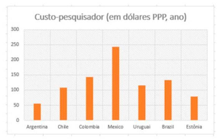 É crucial avaliar o custo do pesquisador, conforme dados também disponibilizados pela Unesco. Esse cálculo é feito dividindo o investimento em P&D (em dólares paritários, ou dólares PPP*) pela quantidade de pesquisadores. No caso do Brasil, o valor foi de 132,6 mil dólares PPP por pesquisador (Figura 3). Esse valor foi maior do que o do Chile e do Uruguai, sendo mais do que o dobro da Argentina (56 mil dólares PPP). Na Colômbia, o custo-pesquisador foi um pouco maior do que o nosso e, no México, foi bem superior. É paradoxal o fato de que países com baixo investimento em P&D acabem gastando mais do que o Brasil em termos per capita (população de pesquisadores).