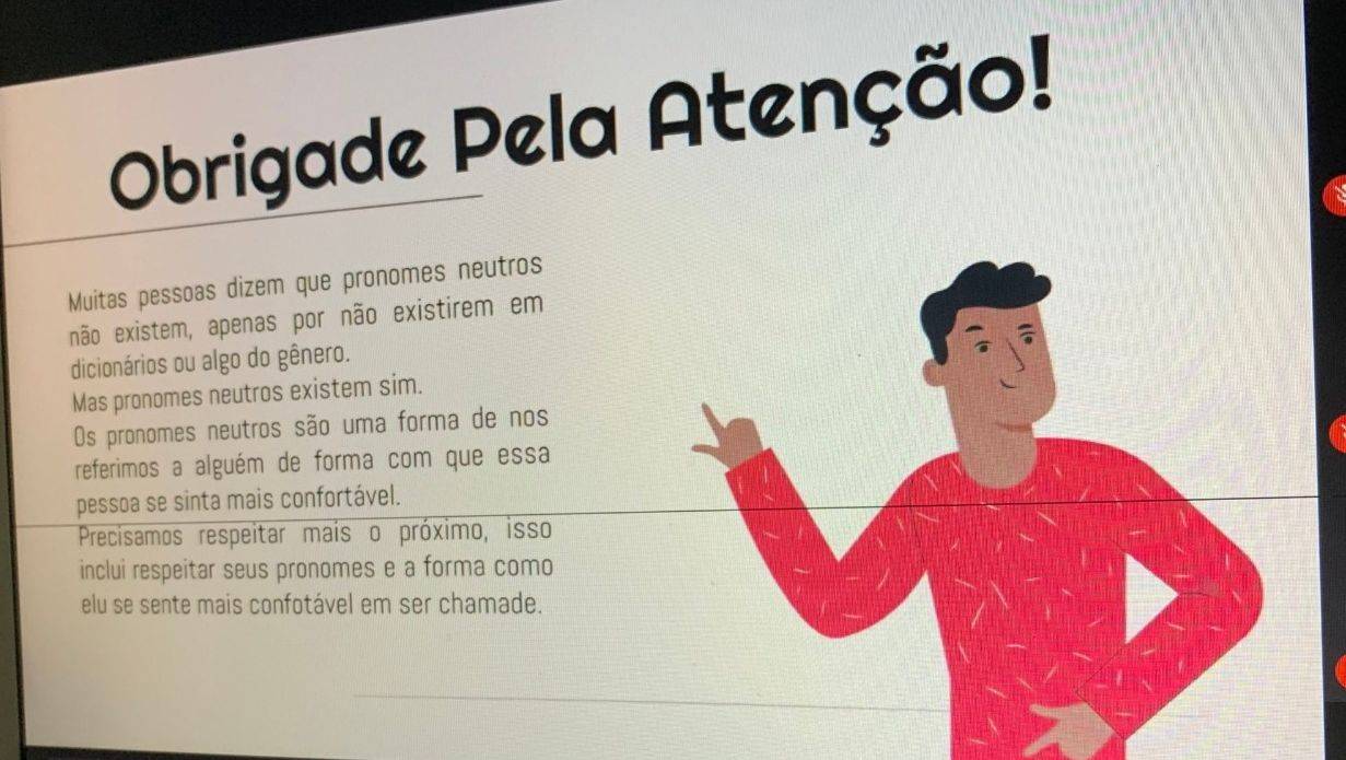 Imagens de uma aula sobre “pronomes neutros” em uma escola particular do Recife (PE) circularam nas redes sociais nesta quarta-feira (9). Nos slides projetados na aula, é possível observar neologismos como “obrigade”. O fato foi registrado no Colégio Apoio e ocorreu em uma turma do 8º ano.