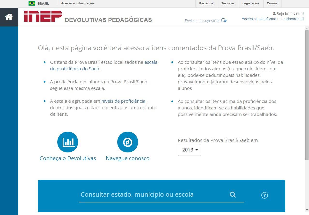 Os dados da Prova Brasil agora podem ser acessados de forma simples e rápida, em um portal na internet. Desenvolvido pelo Instituto Nacional de Estudos e Pesquisas Educacionais Anísio Teixeira (Inep), o Devolutivas Pedagógicas reúne as informações já disponíveis sobre o rendimento e proficiência dos alunos, divididas por instituição, localidade, rede de ensino e com descrições detalhadas de cada uma das questões da prova.