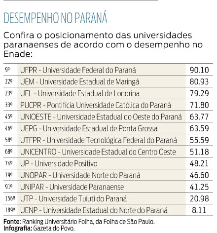 A Universidade Federal do Paraná (UFPR) aparece na 9º posição, seguida pela Estadual de Maringá (UEM), na 22ª colocação, e Estadual de Londrina (UEL), em 23º lugar.