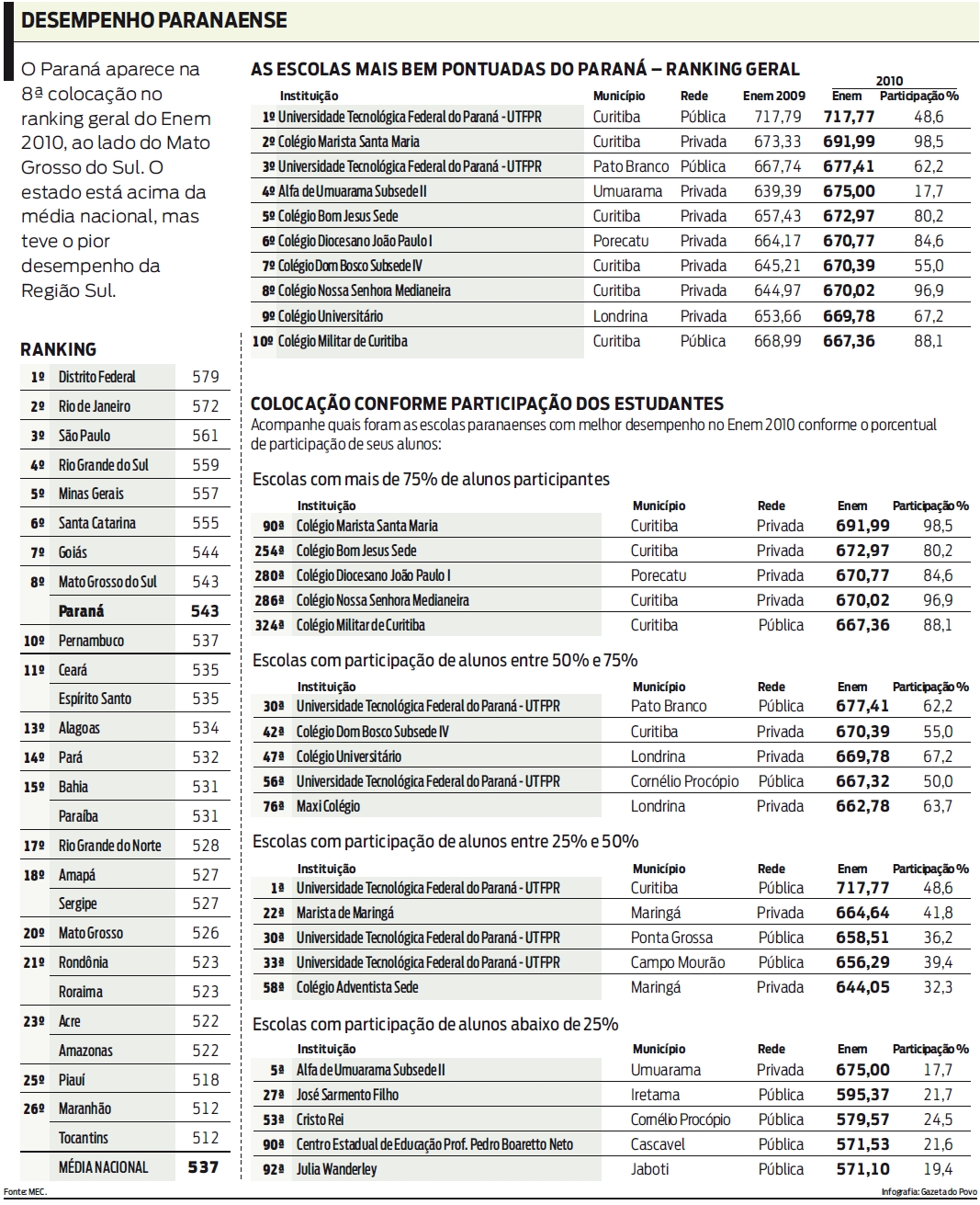 O Paraná é o estado com a oitava melhor média no Exame Nacional do Ensino Médio (Enem) de 2010. Embora a nota de 543 esteja seis pontos acima da média nacional, o estado registrou o pior desempenho da Região Sul. No ranking das escolas paranaenses com as notas mais altas, o câmpus Curitiba da Universidade Tecnológica Federal do Paraná (UTFPR) aparece mais uma vez na primeira colocação, com média 717,77 à frente das instituições particulares. Os dados foram divulgados ontem pelo Ministério da Educação (MEC).A classificação, porém, deve ser vista com cautela. Para Ângelo Ricardo de Souza, doutor em Educação e professor do Núcleo de Políticas Educacionais da Universidade Federal do Paraná (UFPR), mais importante do que ter uma boa posição no ranking é apresentar uma distribuição equânime nas médias do Enem. "Há um limite quando se analisa essa média. Eu abriria mão de ter poucas escolas com médias acima de 700 para não ter nenhuma abaixo dos 500 pontos. Seria melhor do que ter algumas ilhas de altíssimo rendimento com um oceano de tragédias", afirma.