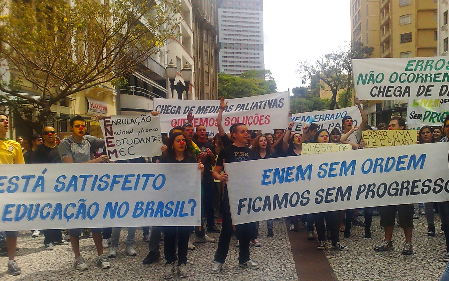 Cerca de 400 estudantes protestaram contra os erros do Exame Nacional do Ensino 2010 (Enem) na Praça Santos Andrade, no Centro de Curitiba, na tarde desta segunda-feira (15). Com faixas, os manifestantes reclamam dos problemas que a prova apresentou. O movimento teve início na Boca Maldita, às 14h30, e seguiu em direção à Praça Santos Andrade, onde se concentraram na escadaria do prédio da Universidade. Em seguida, os estudantes deixaram a praça em direção ao Largo da Ordem, onde o protesto se encerraria.
