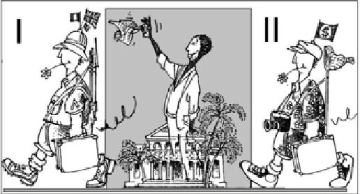 Respostas: a) Após o final da II Guerra, os continentes africano e asiático passaram pelo processo de descolonização. A emancipação política e a luta pela independência transformaram a face política do continente. Na primeira charge vemos o africano se despedindo do colonizador europeu (e o palácio atrás significa a troca de poder), ou seja, é o período da descolonização. Na segunda charge, o retorno do europeu se dá por meio da atividade turística. A sangria deu lugar ao exótico.b) A África do Sul, nação mais rica e industrializada do continente, foi um caso à parte. Rica em recursos naturais, localizada na passagem estratégica do "Cabo das Tormentas", o país passou pela mais violenta e racista forma de dominação branco-europeia na Àfrica. Desde o final do século XIX, leis segregacionistas transformaram a maioria negra em quase escravos da minoria holandesa e britânica no país. Em 1949 nascia o regime racista do Apartheid, portanto no mesmo período da libertação dos povos africanos. Nesse regime, o controle e a dominação branco-européia foi ao extremo, excluindo os negros de todos os setores e atividades econômicas, sociais e culturais do país. O momento I, se é que existiu algum dia, seria a partir de 1994 com o fim do Apartheid e a eleição de Mandela, porém os brancos não deixaram o país como na charge. O desenho II seria o momento atual onde as grandes multinacionais do setor de energia e minérios e o turismo exótico (hotéis de 6 estrelas no meio da floresta) tem atraído turistas e investimentos para o país.