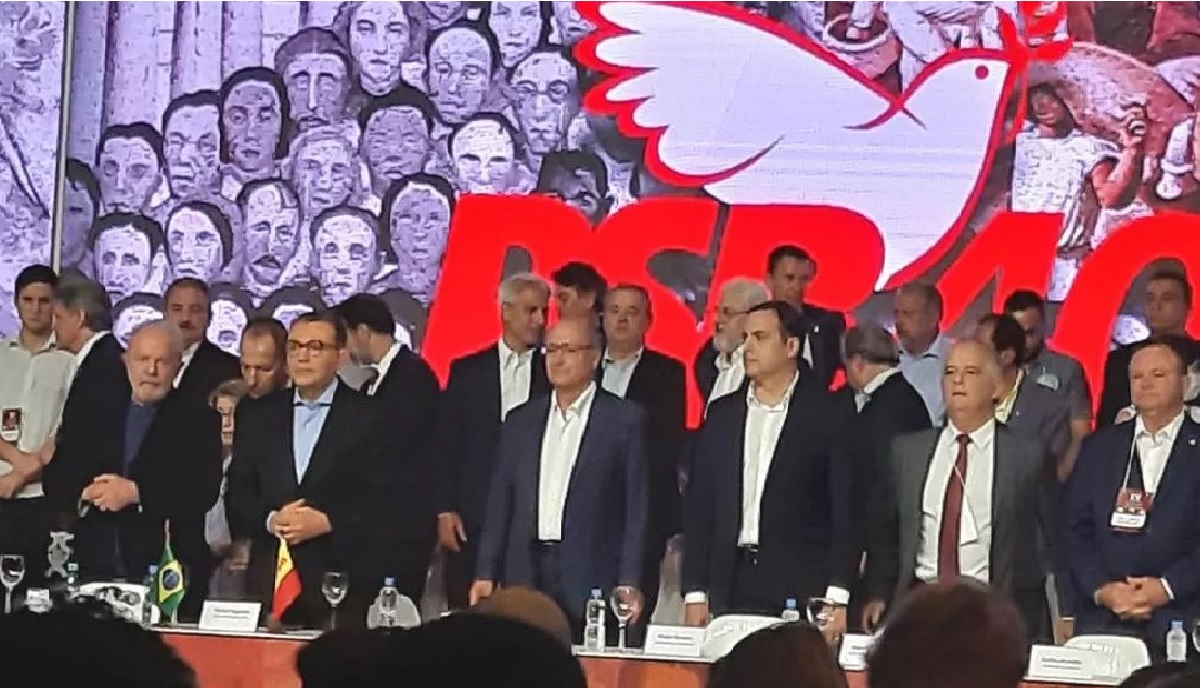 O pré-candidato a vice-presidente da república Geraldo Alckmin (PSB) ouviu, ao lado de Lula (PT), a execução do hino da Internacional Socialista em congresso do PSB realizado na noite desta quinta-feira (27) em Brasília. O ex-governador não cantou, mas aplaudiu ao fim da música. Antes da Internacional, os participantes haviam cantado um trecho do Hino Nacional Brasileiro.