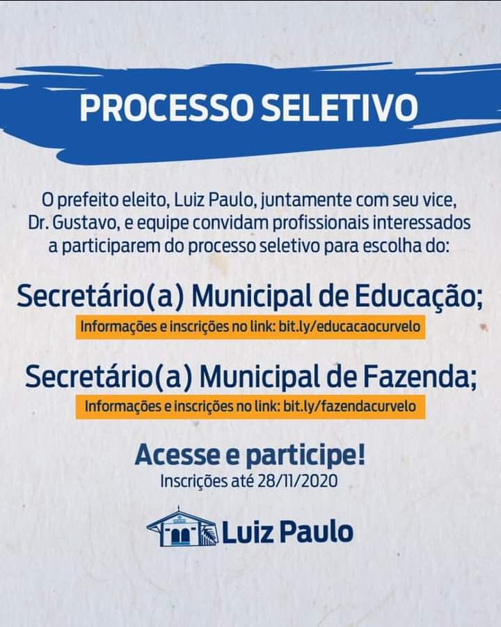 O prefeito eleito do município de Curvelo (MG), Luiz Paulo (PP), abriu uma seleção para escolher quem serão seus secretários de Educação e da Fazenda. De acordo com as páginas para inscrição no processo seletivo, a disputa terá análise de currículo e motivações pessoais, entrevistas e avaliação de referências profissionais.