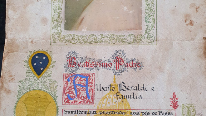 Alberto permaneceu um ano na Guerra. Próximo ao fim dela, foi com 30 pracinhas brasileiros a uma igreja, numa pequena cidade arrasada da Itália. Lá, pediram ao padre local para falar com o Papa, na época, Pio XII. Dias depois, foram atendidos. Levados até o Vaticano, os expedicionários conversaram com Sua Santidade. Um certificado antigo prova o encontro, no dia 18 de julho de 45. “Meu tio disse que Pio XII pediu a eles que não cortassem os cabelos, como uma forma de promessa para a Guerra acabar. E assim, eles teriam feito. Duas semanas após o encontro com o papa, e sem aparar o cabelo, a Guerra acabou”, lembrou Osnei. Após retornar ao Brasil, Alberto nunca mais se esqueceu daquela promessa. E, sempre, em épocas de quaresma, não aparava seus cabelos.