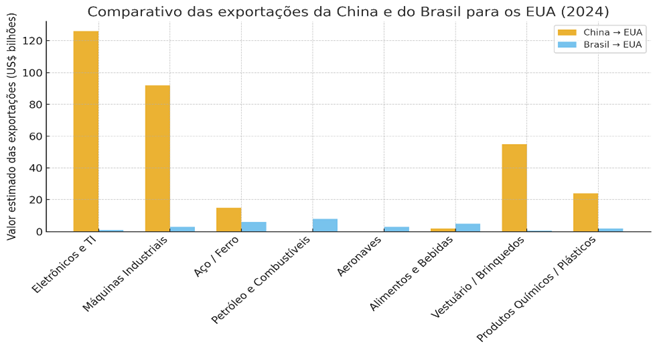 Da mesma forma, a análise setorial das exportações mostra que Brasil e China não competem diretamente no comércio no mercado norte-americano, com as pautas de exportação revelando uma sobreposição apenas residual. Nos poucos setores em que ambos atuam, a natureza da oferta é completamente distinta. No setor de máquinas e equipamentos, a China exporta US$ 92 bi, geralmente produtos acabados, enquanto o Brasil exporta US$ 3 bi, focados em nichos como máquinas agrícolas e partes aeronáuticas.