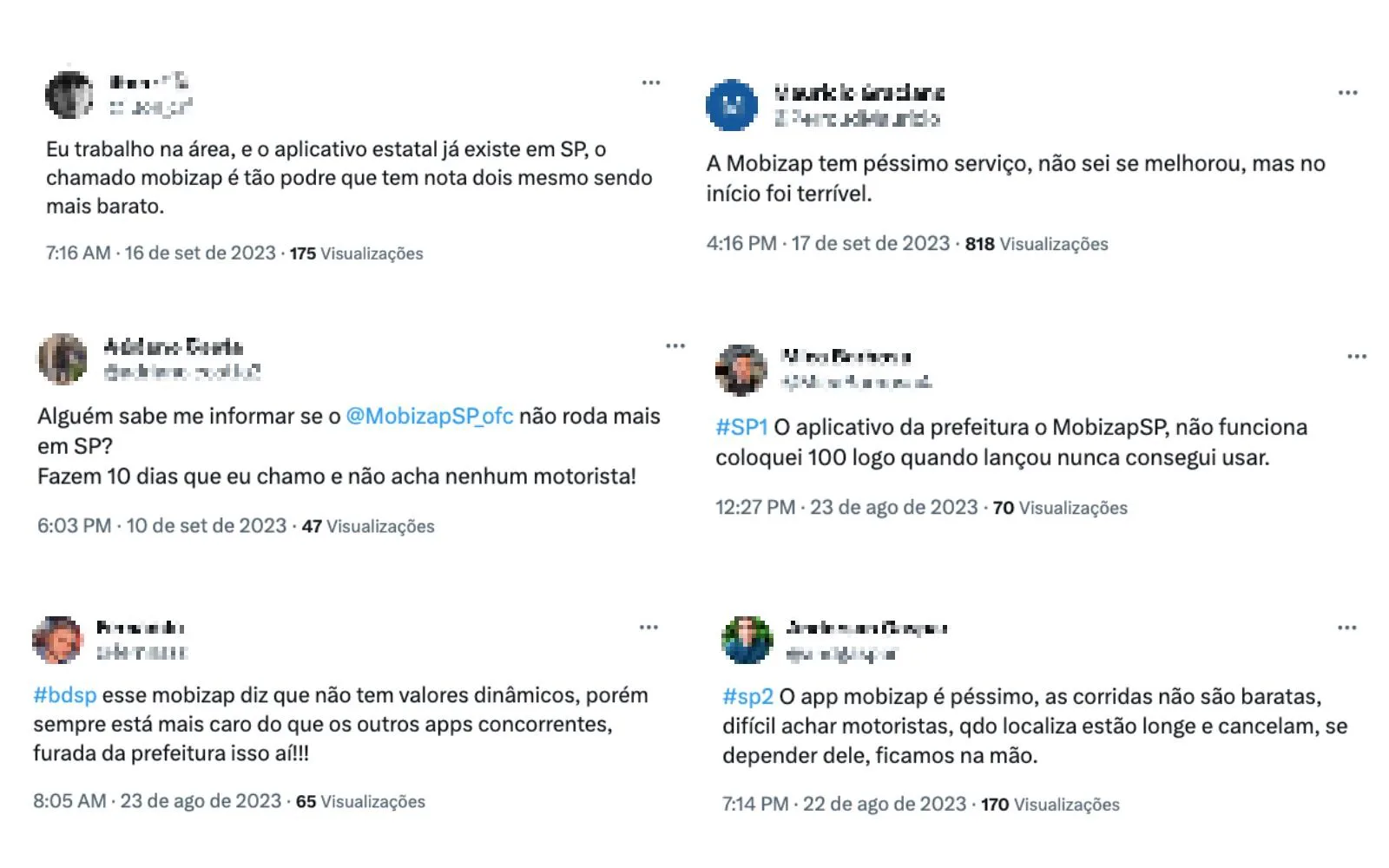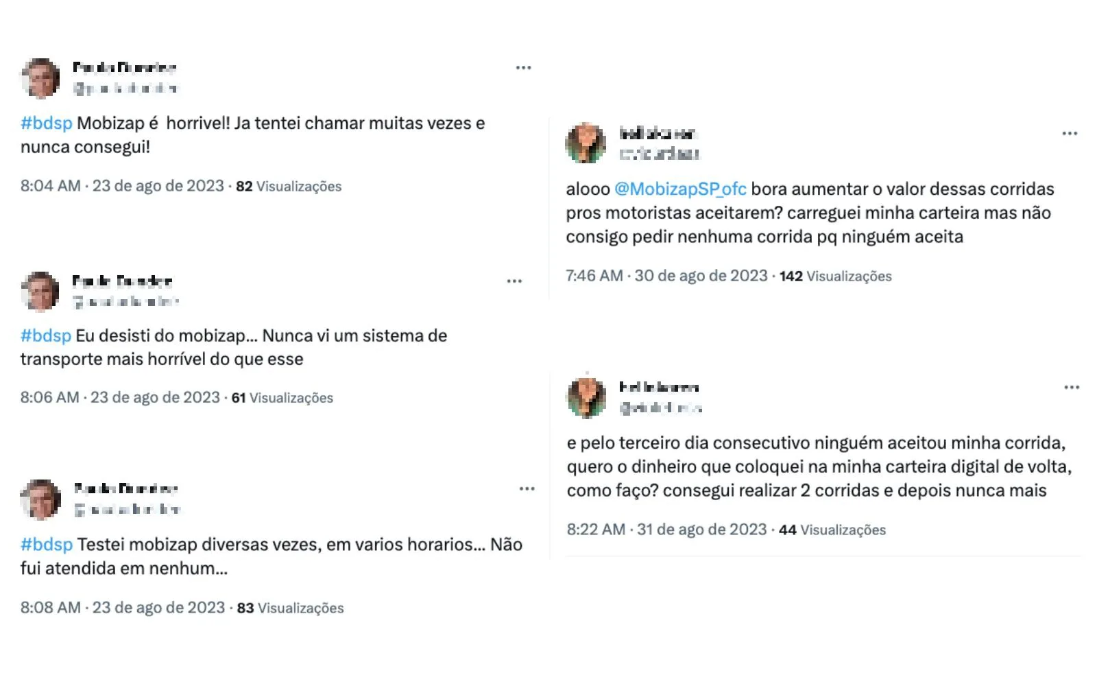 O perfil oficial do mobizapSP no X, antigo Twitter, está repleto de reclamações de usuários, que reportam falta de carros para atender seus chamados e preços não atrativos, entre outras queixa.