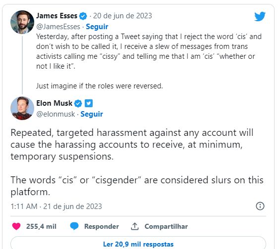 Na noite de terça-feira, ele publicou um tweet no qual afirmou que "As palavras 'cis' ou 'cisgênero' são consideradas insultos nesta plataforma", ao se pronunciar sobre o assédio online reportado pelo usuário James Esses. Até o momento, a resposta de Musk já conta com 255 mil curtidas, 31,5 mil replicações e 18,7 mil comentários.