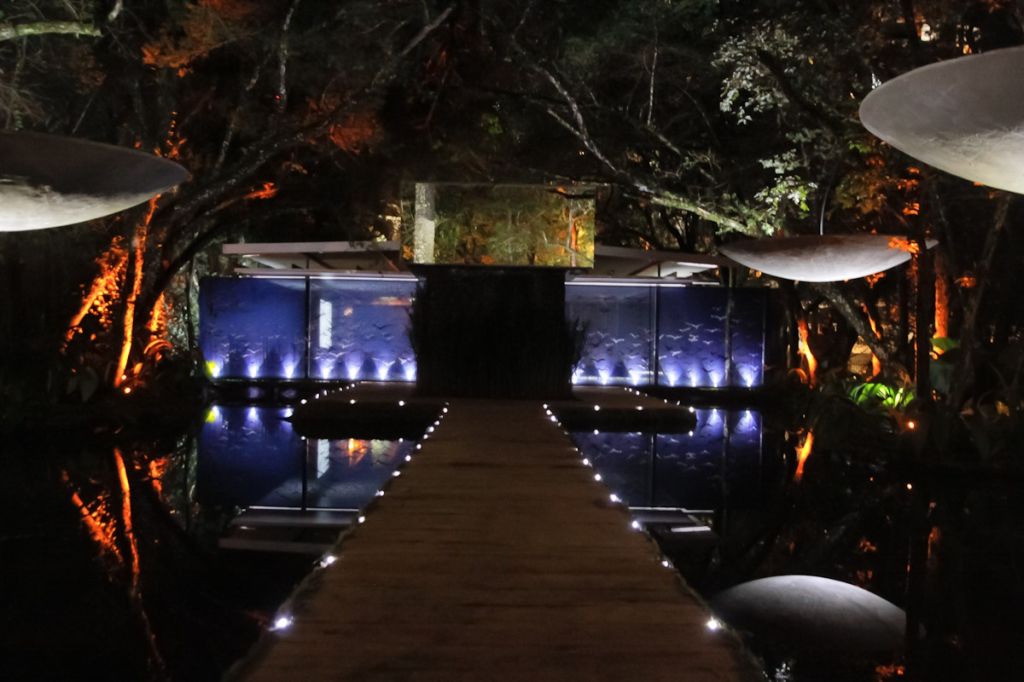 Quem visita o Pórtico de Entrada, do arquiteto Wilson Pinto, pode pensar estar caminhando em um piso de madeira, mas, na verdade, o material é cimento estampado. "Não utilizei nenhum pedaço de madeira em todo o espaço, que tem toda a estrutura em isopor", diz o arquiteto. A iluminação é de led. "Mesmo assim proporciona um efeito de luz que é suficiente para o ambiente". O arquiteto destaca, ainda, a manta de geomembrana utilizada para construir os dois espelhos dágua do local. "Evita a mão de obra de cavar, jogar cimento, impermeabilizar. Além de não ser danificada por qualquer abalo. Essa manta pode ser reutilizada em qualquer lugar e tem garantia de 20 anos."
