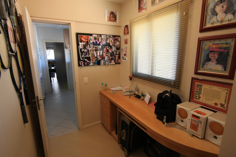 "Transformei o quartinho em escritório desde que comprei o apartamento", diz a empresária. "Eu e meus filhos usamos bastante, é um espaço bom e agradável".