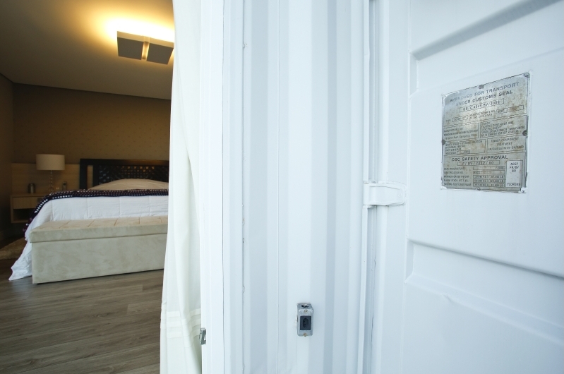 Há ganhos estéticos também. Detalhes originais do contêiner, como portas e placas que indicam especificações técnicas, podem ficar aparentes, revelando um projeto moderno.