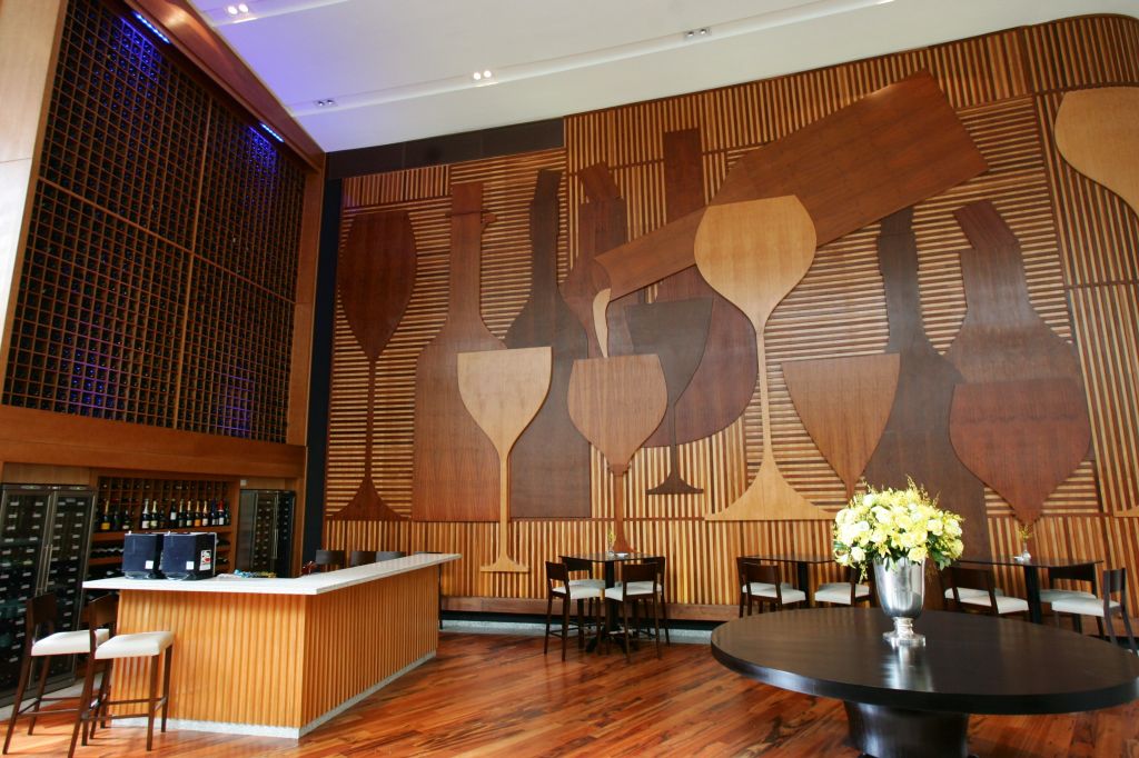 Anna conta que o projeto solicitava a criação de uma grande adega e que o ambiente tivesse características contemporâneas. Um dos destaques na decoração é um painel em madeira, com 7,20 metros de altura e 18 metros de comprimento. A arte, com motivos que remetem ao vinho, é uma criação do arquiteto Eli Loyola. "O trabalho com a madeira foi um grande desafio, mas o resultado é um ambiente acolhedor e aconchegante. Sem contar que o uso de madeira em decoração está em alta", analisa Anna.