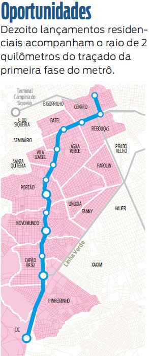 São apartamentos de um, dois e três quartos, de diferentes faixas de preço. Pela lógica do mercado atual, a faixa mais valorizada do traçado do metrô vai do Centro ao Portão cerca de R$ 5 mil o metro quadrado. Dali até o Pinheirinho, os preços são mais baixos: uma média de R$ 3 mil o metro quadrado. Ainda assim, a expectativa é de que, principalmente depois do início das obras, no segundo semestre de 2012, os valores dos terrenos e, consequentemente, dos empreendimentos do entorno sofram um aumento. De quanto exatamente só o mercado dirá com o tempo, mas uma pesquisa de 2010 da Companhia do Metropolitano de São Paulo aponta que a valorização dos imóveis do entorno de uma das linhas de metrô mais nobres da cidade, a linha 4 ou amarela, é de até 30%.