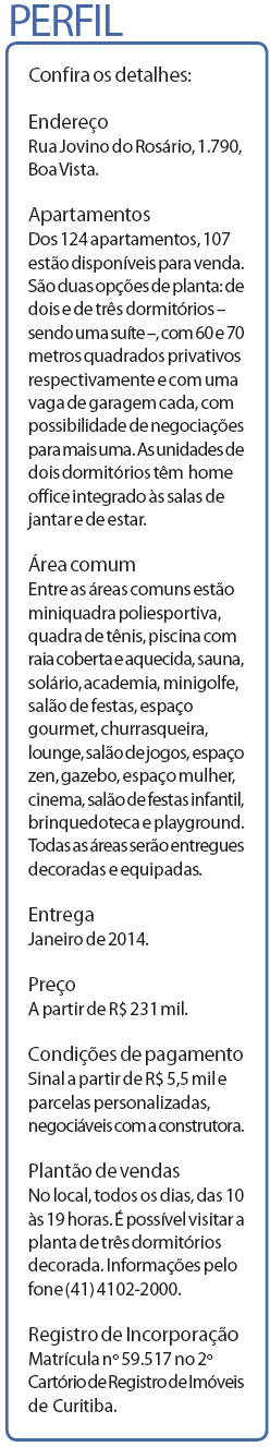 A incorporadora e construtora Vanguard Home iniciou as vendas dos apartamentos da Torre 3 do condomínio residencial Garden Sevilha que comportará três torres -, localizado em uma área de 8.450 metros quadrados na Rua Jovino do Rosário, 1.790, no bairro Boa Vista (paralela à Av. Paraná, próximo ao Parque Bacacheri). O início da construção da torre está previsto para outubro de 2011. O gerente regional da Vanguard Home, Álvaro Fernandes Coelho, considera que a localização é um dos pontos fortes do residencial. "Ele une a vista para um parque à proximidade com o Centro Cívico, bairro em que muitas pessoas trabalham."