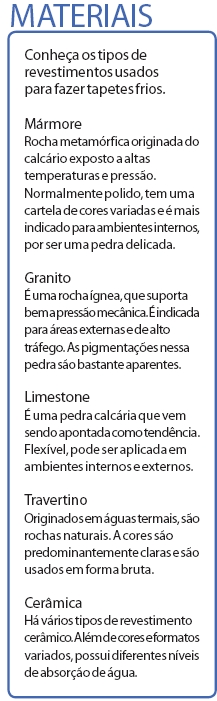 Para áreas internas e externas, a cerâmica é uma opção para quem não quer gastar muito com o revestimento. Para instalação, o piso pode ser retirado ou colocado por cima do anterior. "Obrigatoriamente, esses tapetes não precisam ser feitos com pedras. Madeira e azulejos hidráulicos são outras opções de revestimento", ressalta a arquiteta Karin Brenner.No caso dos cerâmicos, a decoração é feita com o próprio produto, para manter o mesmo conceito e estilo. Algumas empresas comercializam desenhos pré-moldados para os clientes, que tem a opção de personalizar o projeto de acordo com a área utilizada.
