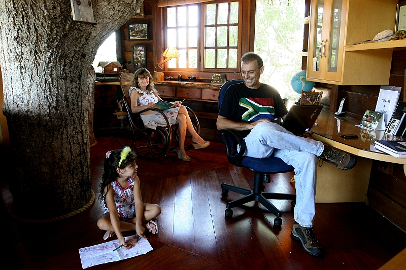 A construção de uma cabana com estrutura de bambu e cobertura de folhas de bananeira, no alto de um abacateiro, a 5 metros do chão, marcou e deu rumo à vida do administrador Ricardo Brunelli. Foi em 1976, no município de Rolândia, no Norte do Paraná. Ele e dois amigos até conseguiram passar uma noite na frágil estrutura, mas choveu, a casa molhou por todas as partes e o sonho dos meninos desmoronou. "Fiquei com aquilo na cabeça e disse a mim mesmo que um dia iria construir uma casa na árvore de verdade", conta Brunelli, que foi mais longe e é proprietário da empresa Casa na Árvore, em Londrina. O administrador realiza o desejo de crianças e inclusive de adultos, que um dia sonharam em ter a casa na árvore para se aventurar e usar como esconderijo na hora das brincadeiras e momentos de mau humor.Na residência onde mora, Brunelli caminha 40 passos, sobre uma passarela, do quarto até o home office de 32 metros quadrados, localizado na casa da árvore. "É um privilégio trabalhar em um ambiente tranquilo e acompanhar a vida dos pássaros daqui de cima", revela, do alto de seu refúgio. A mulher, Denise, aproveita o espaço como um local para leitura, e a filha, Giovana, tem sua própria casa na árvore, de 14 metros quadrados, logo abaixo, bem mais próxima do chão.