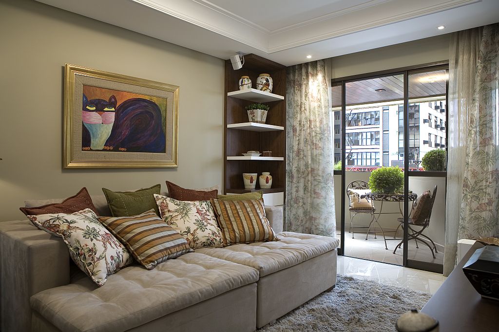 Nos tons dos tecidos e revestimentos a área social ganhou porcelanato crema marfil (que lembra a textura de um mármore bege) e a íntima carpete predominam o branco, o bege e o fendi. O uso de um só revestimento na área social ajuda a criar a impressão de amplitude. Há espaço também para listras e estampas, como nas várias almofadas do sofá da sala íntima, próximo à varanda. Ali a seda, o chenile e o algodão dão um toque confortável, próprio para um ambiente destinado ao conforto da família o mesmo acontece com a camurça das cadeiras da sala de jantar. As organzas escolhida para as cortinas e persianas, sem forros, são leves, apenas com a função de barrar a luz direta sobre os móveis. Enquanto na área social o branco foi predominante, nas cortinas da suíte do casal houve uma mescla com uma organza estampada. "O mesmo tom de rosa da estampa serviu para revestir o pufe do closet do casal, que serve de apoio para sentar ou colocar roupas."