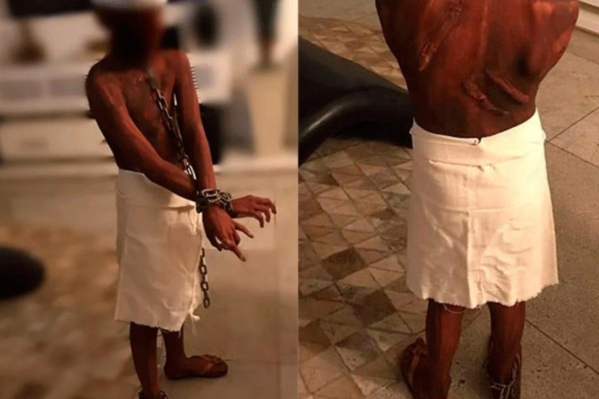 Nas fotos, a criança usa maquiagem para simular as escaras de cicatrizes e ferimentos no corpo. Vestido apenas com algumas túnicas brancas, simulando um calção e uma faixa na cabeça, o menino também usa imitações de correntes e grilhões, instrumentos usados na tortura e aprisionamento de escravos.