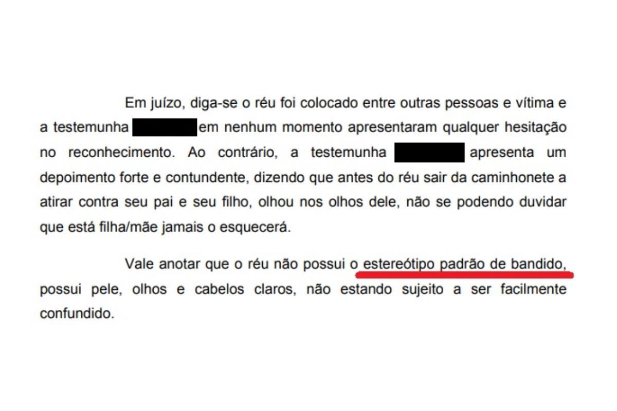 “Em juízo, diga-se que o réu foi colocado entre outras pessoas, e vítima [sobrevivente] e testemunha em nenhum momento apresentaram qualquer hesitação no reconhecimento. Ao contrário, a testemunha apresenta um depoimento forte e contundente, dizendo que antes do réu sair da caminhonete a atirar contra seu pai e seu filho, olhou nos olhos dele, não se podendo duvidar que está filha/mãe jamais o esquecerá. Vale anotar que o réu não possui o estereótipo padrão de bandido, possui pele, olhos e cabelos claros, não estando sujeito a ser facilmente confundido”, escreveu na sentença.
