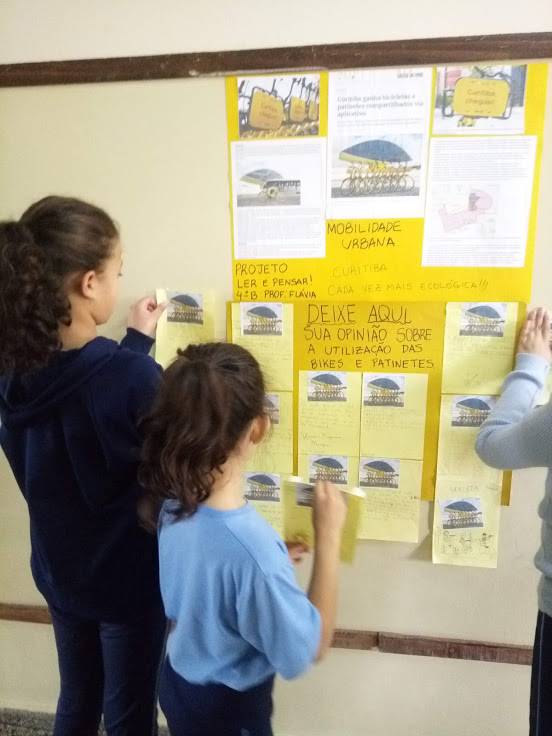 Após o momento de reflexão, foram feitos cartazes em que os alunos puderam colocar a sua opinião sobre as bicicletas. A professora se pautou nas competências específicas de linguagens no Ensino Fundamental da BNCC, que tem como objetivo compreender e utilizar tecnologias digitais de forma significativa e reflexiva, e também na competência sete da base, incentivando os discentes a argumentar com base em fatos, dados e informações confiáveis. Flavia nos conta que o resultado da atividade foi muito positivo, pois a partir dos conhecimentos que os alunos adquiriram na sala de aula, eles puderam compartilhar com os seus familiares.