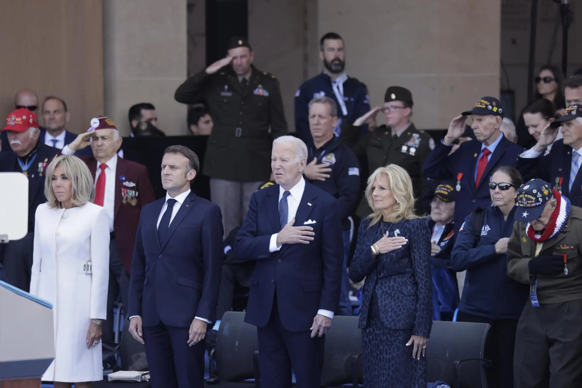 Macron condecorou três veteranos dos Estados Unidos com a Legião de Honra, a mais alta ordem de mérito da França, também comparou o momento atual com a guerra contra os nazistas e se dirigiu a Zelensky.