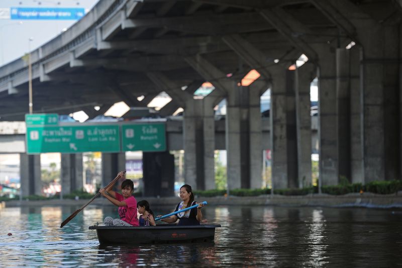 Mulher usa barco em Bangcoc, na Tailândia, para enfrentar as inundações que atingem a capital do país. As enchentes são consideradas as piores em meio século. Além da capital, outras 18 províncias foram atingidas pelo excesso de chuvas, que afeta 5,4 milhões de pessoas. Para tentar combater o problema, a cidade recebe uma exposição de invenções antienchente iniciativa elogiada pelo secretário-geral da ONU, Ban Ki-moon.